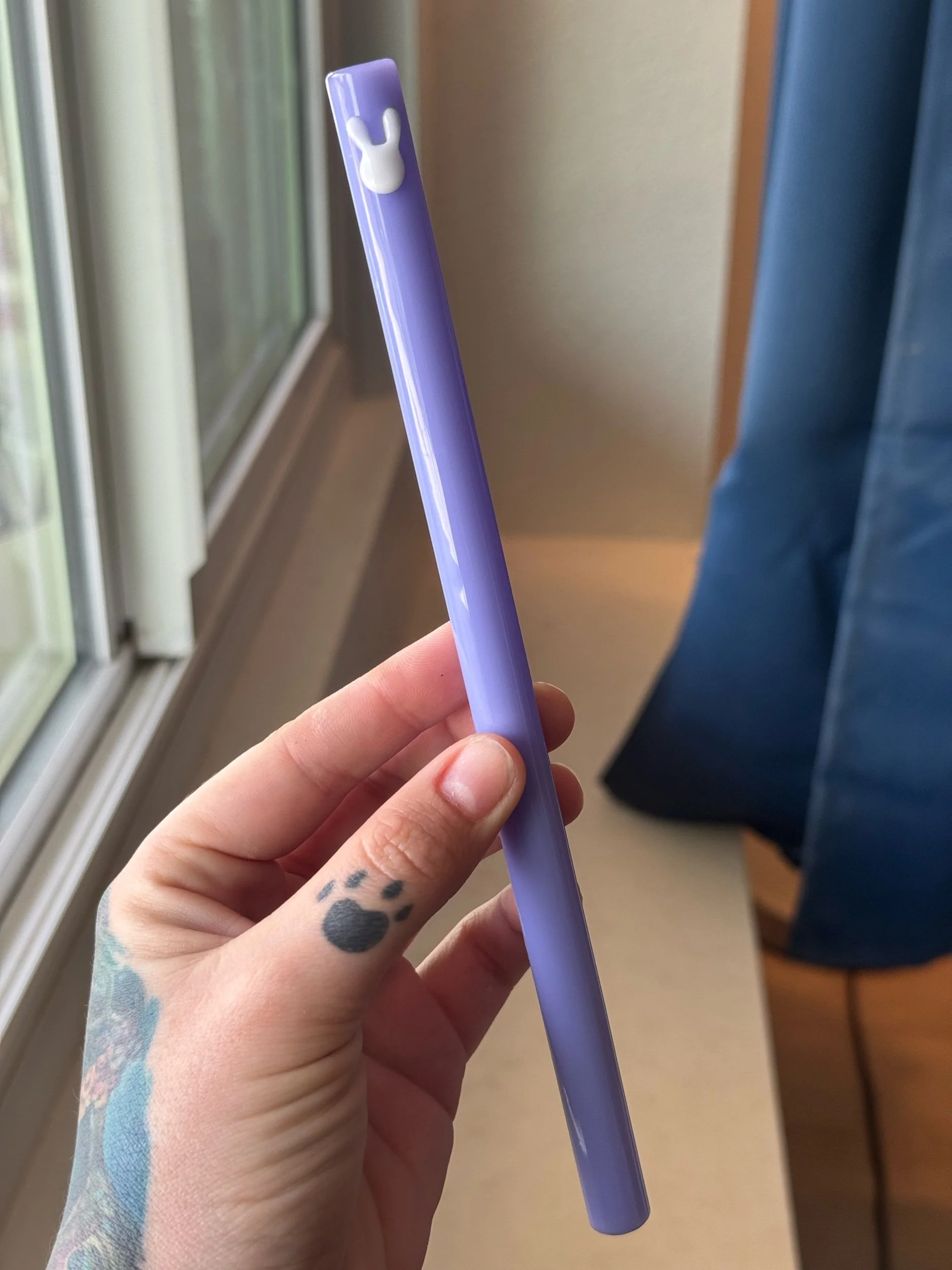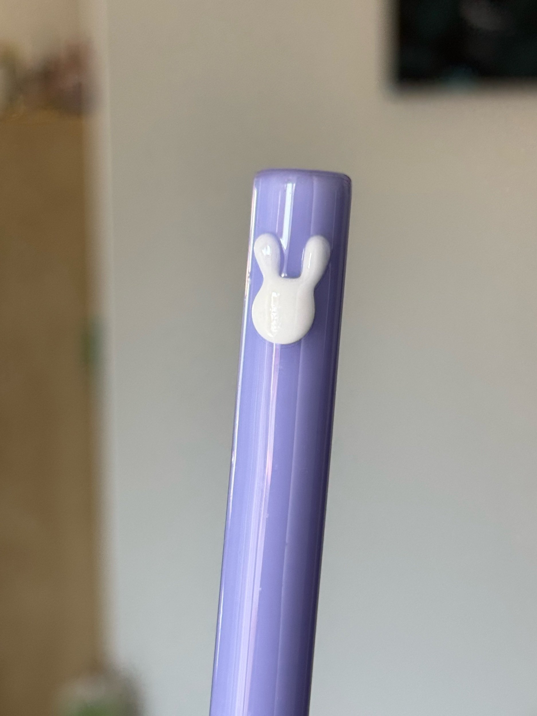 Handcrafted borosilicate glass bent straw featuring a single white bunny head silhouette on purple tubing.
