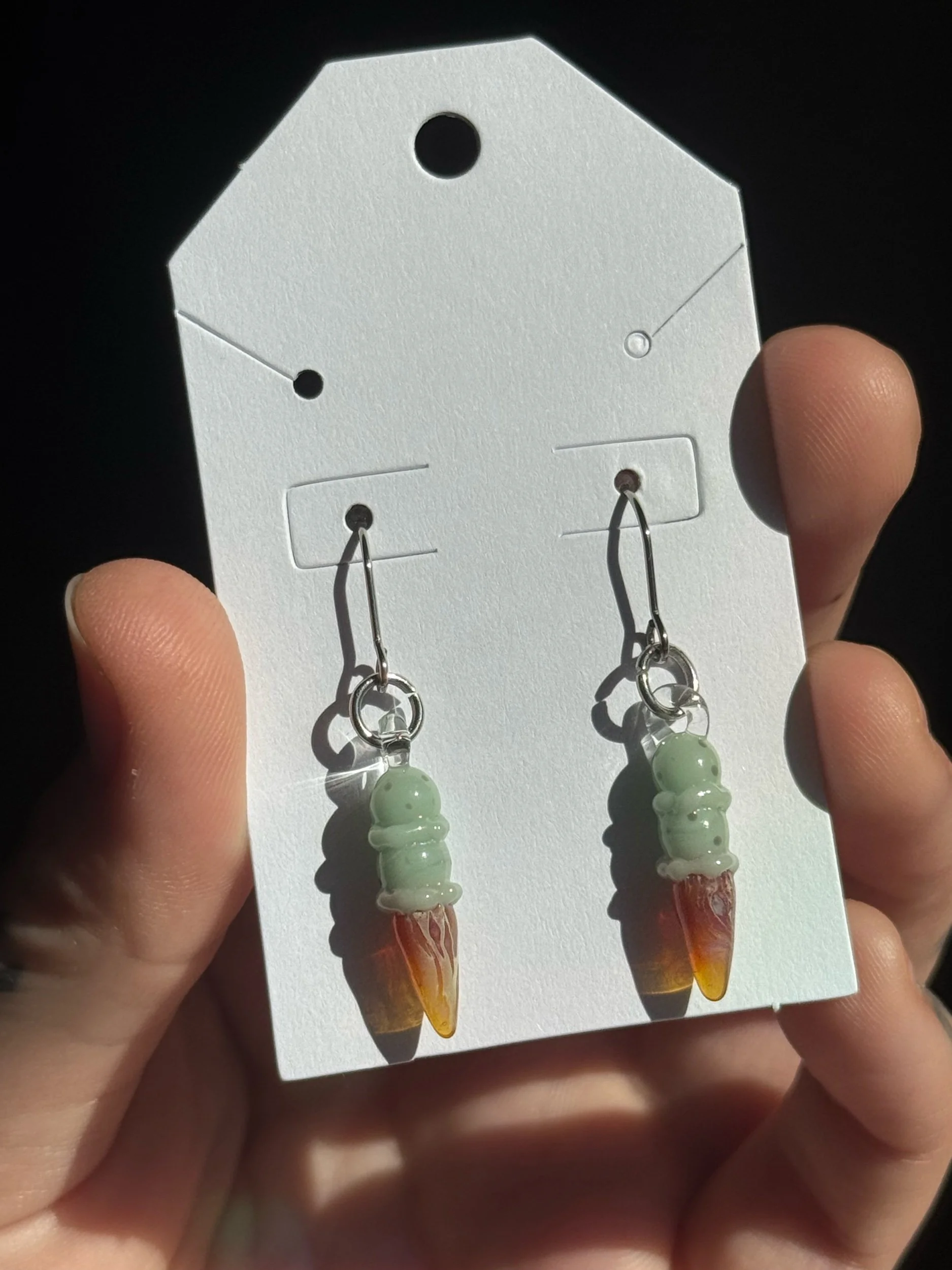 These experimental leaf earrings were created using Greasy Glass green tones, producing a vibrant organic color with natural depth and variation.