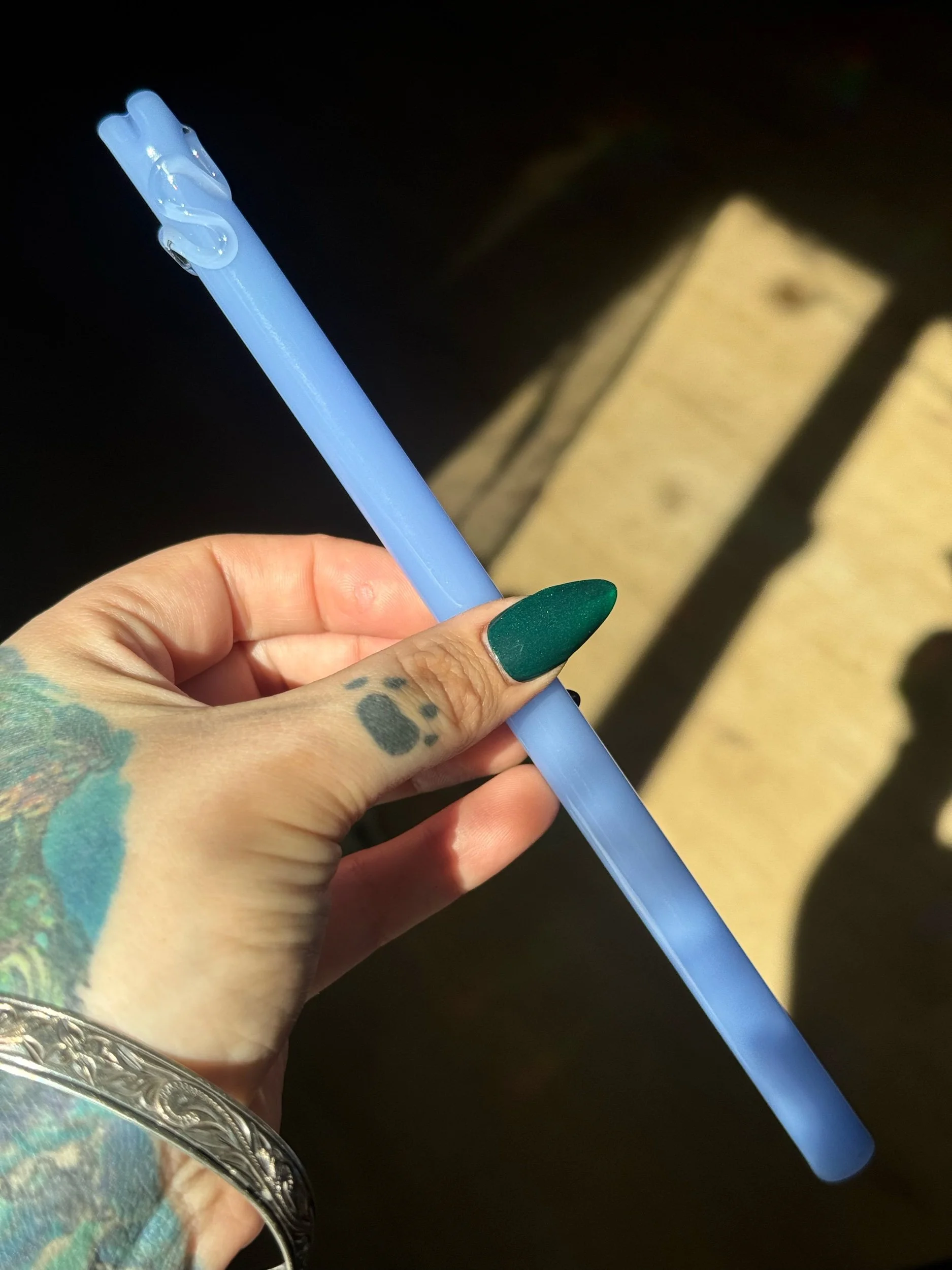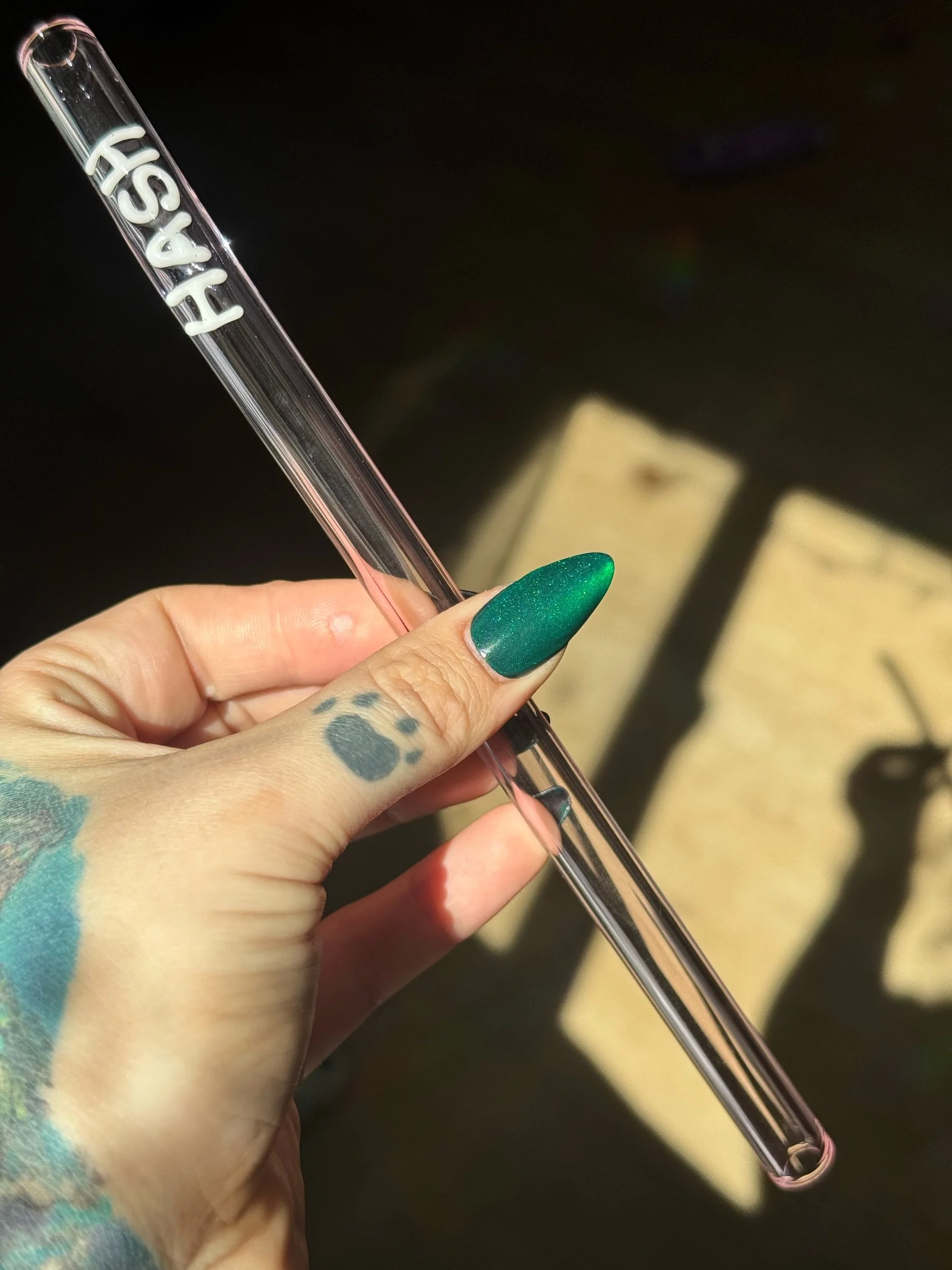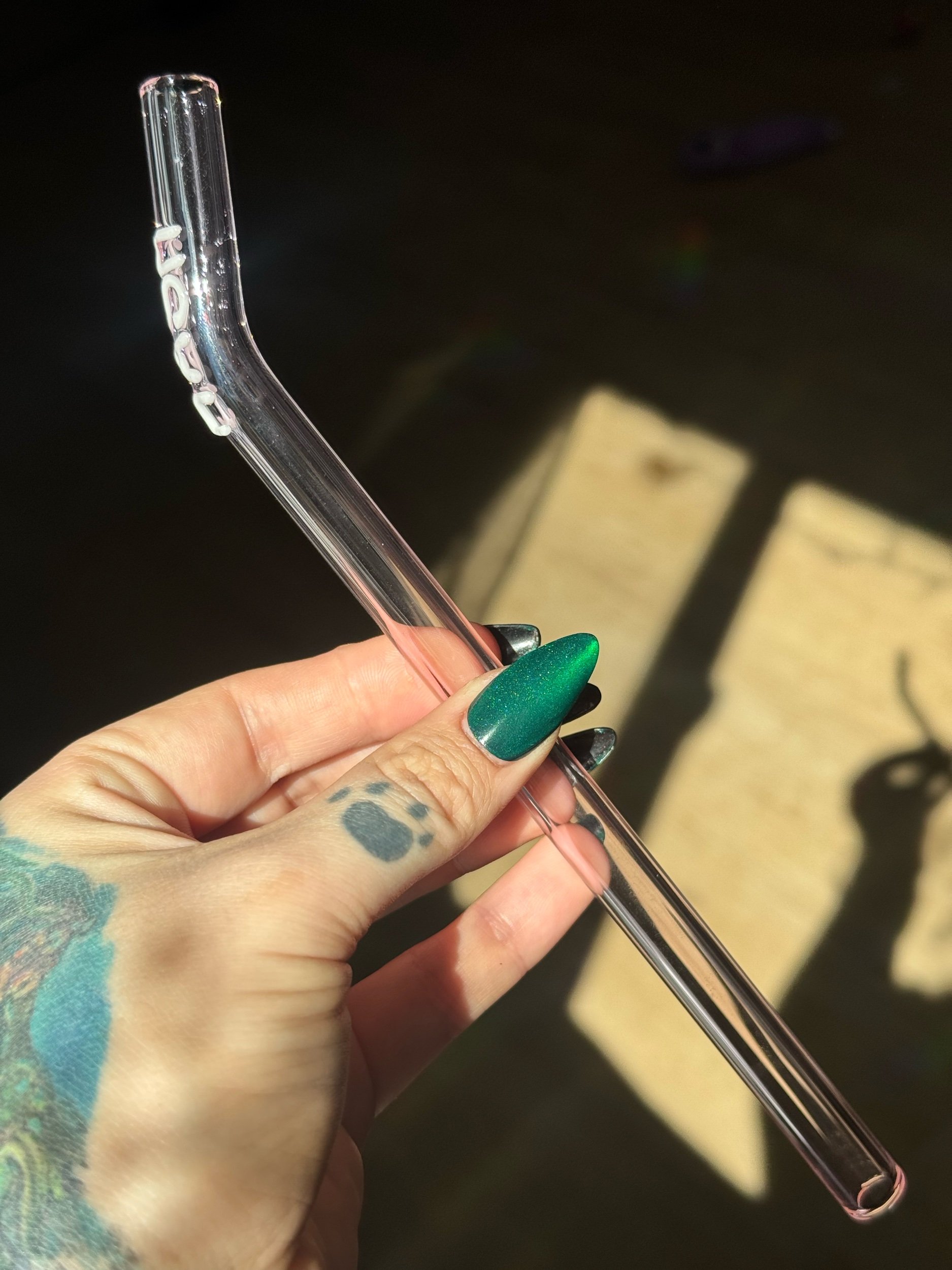 Handcrafted borosilicate glass bent straw featuring “hash” in star white on pink tubing.
