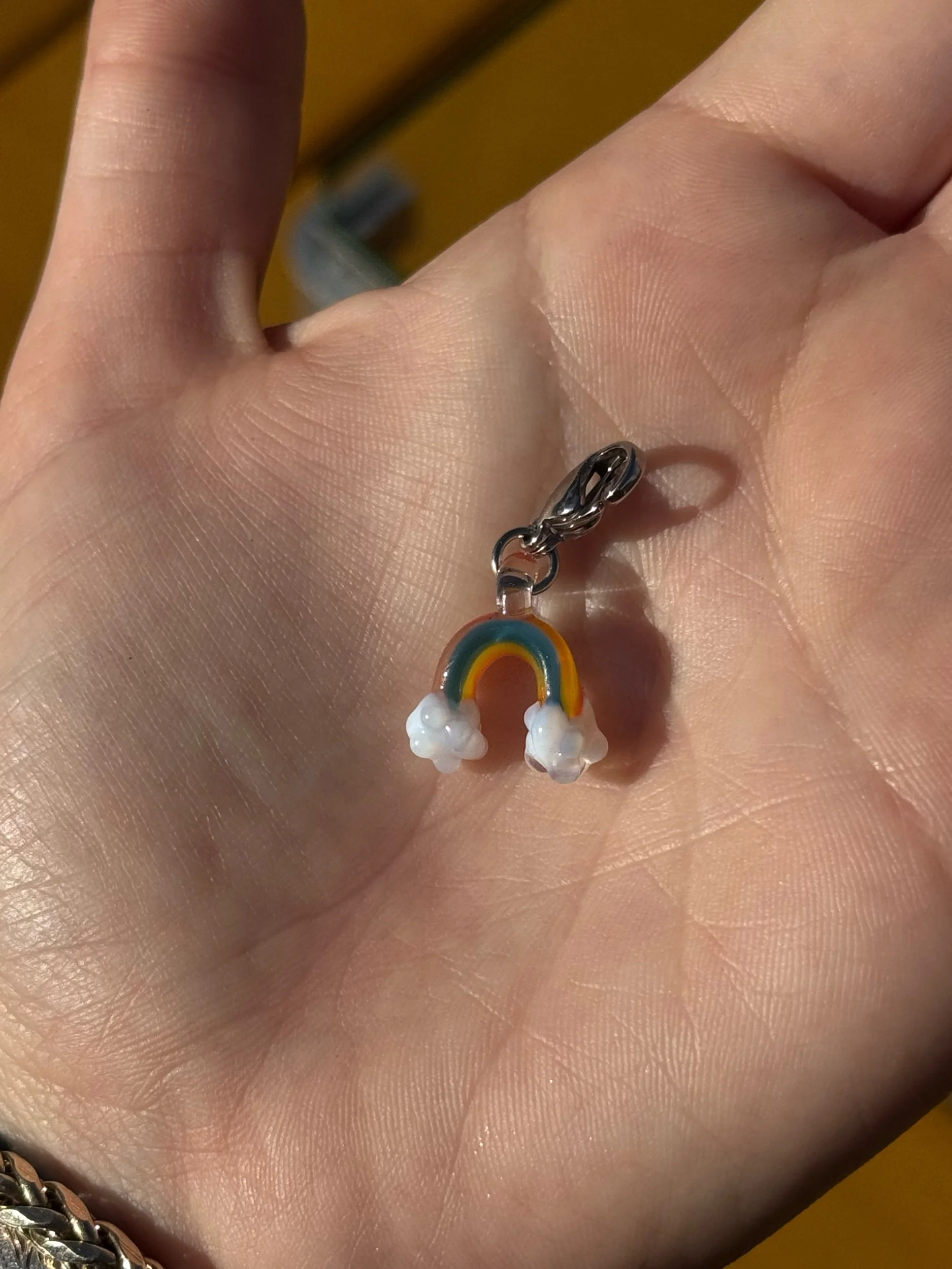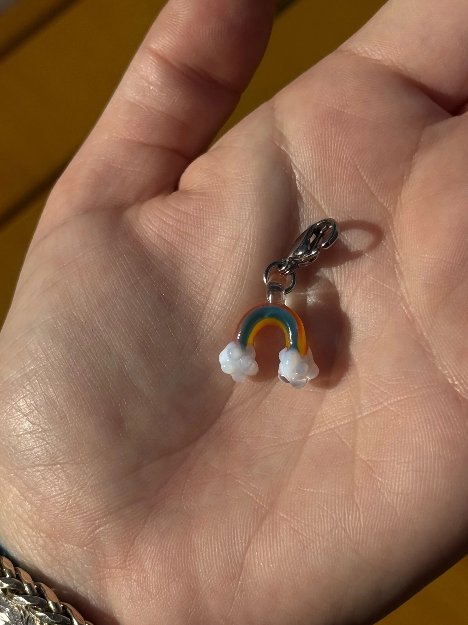 A tiny rainbow sculpted in glass, finished with soft lotus style clouds. This borosilicate charm features a curved rainbow pulled from six vibrant colors with delicate white lotus clouds at each end.