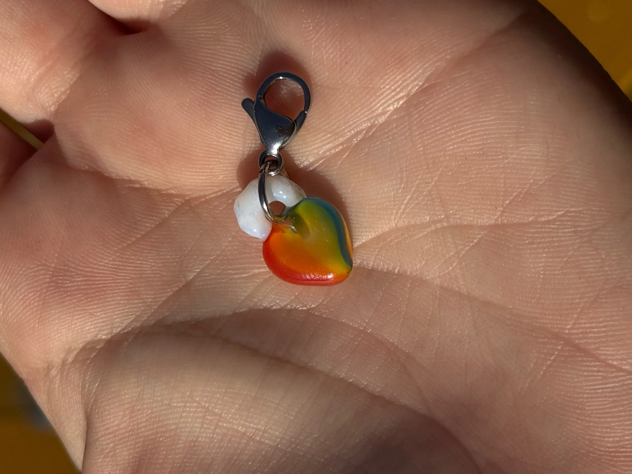 A playful twist on the classic rainbow. This borosilicate glass charm features a sculpted rainbow heart finished with a cloud loop bale, giving the piece both movement and personality.